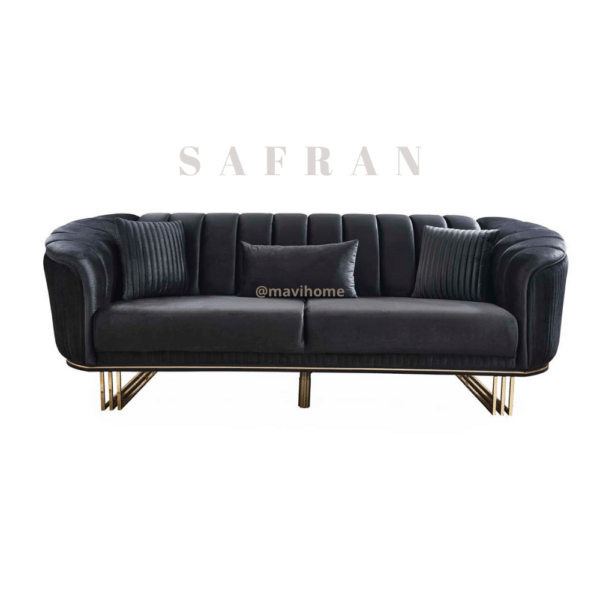 Le canapé Safran est une pièce maîtresse qui marie élégance et modernité grâce à son design audacieux et ses détails luxueux. Avec ses courbes délicatement sculptées et son revêtement en velours noir profond, il incarne le chic contemporain tout en offrant un confort optimal. Son dossier capitonné, orné de coutures verticales, apporte un effet texturé qui accentue son caractère raffiné. Les accoudoirs légèrement arrondis et enveloppants créent une sensation de cocooning, parfaite pour se détendre. Ce canapé repose sur une structure en métal doré, dont les pieds fins et géométriques ajoutent une touche de légèreté et d’élégance. Conçu pour les amateurs de design haut de gamme, le modèle Safran s’intègre aussi bien dans des intérieurs modernes que dans des espaces plus classiques, où il devient rapidement la pièce centrale, grâce à son allure à la fois sophistiquée et audacieuse.